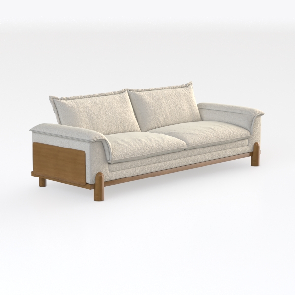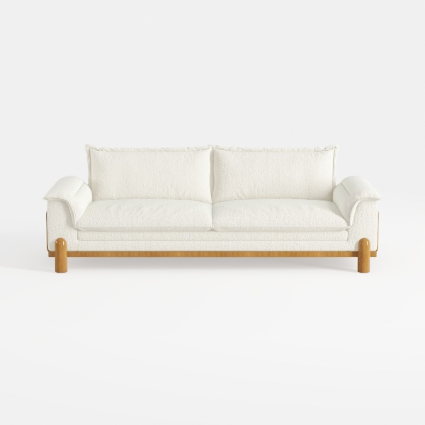 The visual appeal of this sofa is enhanced by its clean, minimalist silhouette and warm wooden legs, creating a harmonious balance between contemporary aesthetics and cozy charm. Suitable for living rooms styled in a modern or minimalist theme, it pairs exquisitely with accessories like a sleek marble coffee table and metallic accents to elevate your space.