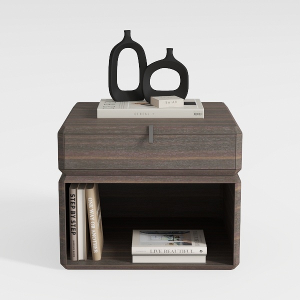 The surface showcases a rich, matte finish with subtle, flowing wood grain patterns—intricate yet understated, catching light softly to reveal the depth of the material. The deep, muted gray-brown hue, accented with warm amber undertones, exudes a grounded, sophisticated presence, making it a versatile fit for various interior palettes. The structured silhouette, with its balanced two-tier design—an upper drawer and a lower open shelf—creates visual rhythm, while the sleek, unadorned drawer front (fitted with a minimal metallic handle) contrasts gently with the open shelf’s airy, accessible space.