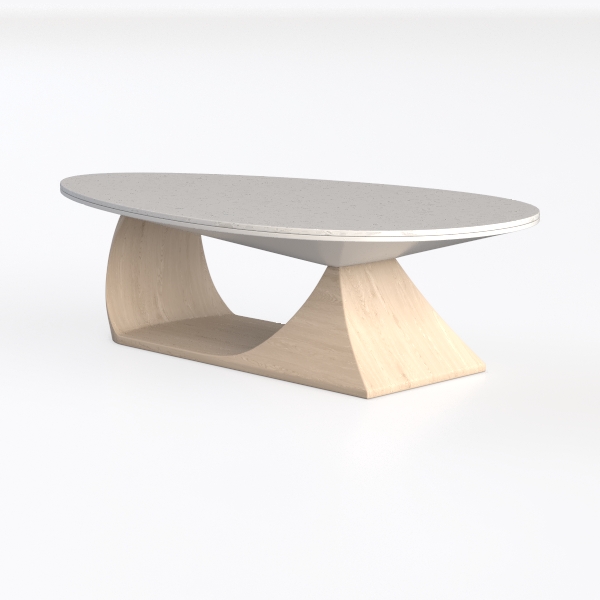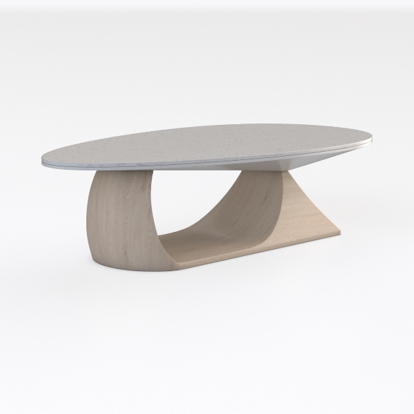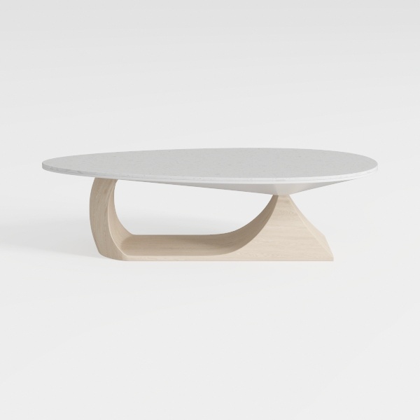 Designed with organic minimalism as its guiding principle, this piece takes cues from the fluidity of natural landscapes—imagine the soft curves of a sand dune or the gentle arc of a wave frozen in time. The tabletop, a smooth expanse of light gray, subtly veined surface, evokes the quiet elegance of polished concrete or marble, its matte finish catching light to reveal delicate, natural patterns. Below, the lower shelf, crafted from warm, light oak, features a sinuous, arching design that mimics the flow of water, its soft grain and smooth edges inviting gentle touches. Visually, the contrast between the cool, textural top and the warm, organic wood of the base creates a balanced, grounded yet airy feel, making it a serene addition to any space.