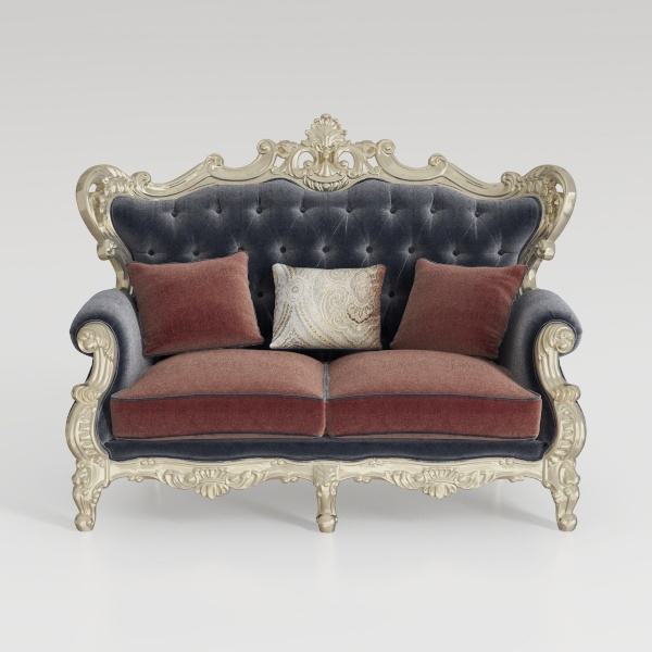 This sofa marries the timeless elegance of 18th-century European rococo design with modern practicality, creating a statement piece that feels both historically rooted and fresh. Its frame, crafted with intricate, silver-toned carvings, shimmers subtly under light, with elaborate scrollwork and floral motifs adding depth and artistry. The deep, plush cushions are upholstered in rich navy velvet, offering a luxuriously soft touch that invites relaxation, while two burgundy velvet throw pillows add warmth and contrast, balancing the cool metallic accents.