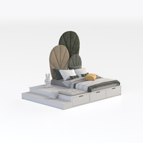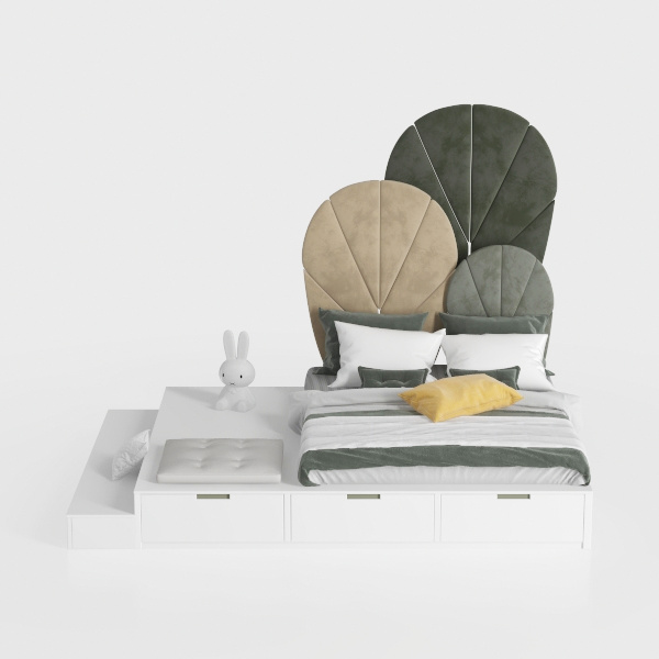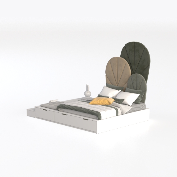 Inspired by organic, leaf-like forms, this bed features soft, textured upholstery in muted tones—olive, taupe, and sage—contrasting with crisp white frames, creating a warm yet minimalist vibe. Ideal for a cozy kids' room or serene master bedroom, blending playful charm with understated elegance, it also offers spacious under-bed drawers for practical storage.