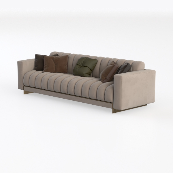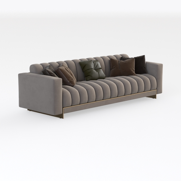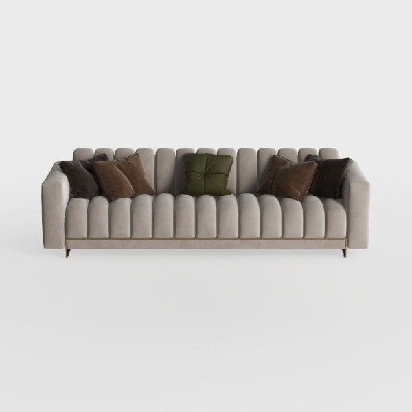 Crafted with a soft, velvety upholstery in a warm, muted gray, it feels inviting to the touch, its plush texture yielding gently under pressure like a cloud. The vertical channeling along the back adds subtle dimension, creating a rhythmic pattern that catches the light softly, while the slim, gold-toned metal legs provide a delicate lift, balancing the sofa’s substantial presence with a light, airy vibe.