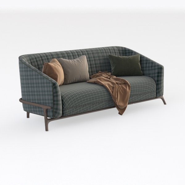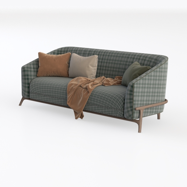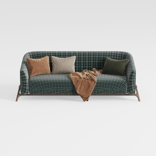 This sofa draws inspiration from the timeless charm of classic check patterns reimagined for modern living, blending nostalgic warmth with contemporary comfort. Crafted with a soft, textured green-and-white check fabric, its surface feels gentle to the touch, while plush velvet and cotton cushions—adorned in earthy tones of caramel, cream, and deep forest green—add layers of tactile richness. Visually, the sofa exudes a balanced elegance: the rounded, curvy silhouette softens the space, while slender metal legs in a warm brass hue elevate its lightness, making it both grounded and airy.