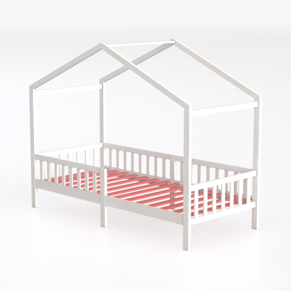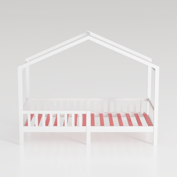 Designed to evoke cozy childhood memories, this bed features a house-shaped frame with crisp white lines. Smooth, matte surfaces and soft red-and-white striped bed slats create a warm, tactile contrast. Perfect for a minimalist or Scandinavian kids’ room, it pairs beautifully with fairy lights and pastel decor, offering spacious, playful comfort for two.