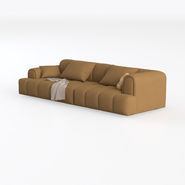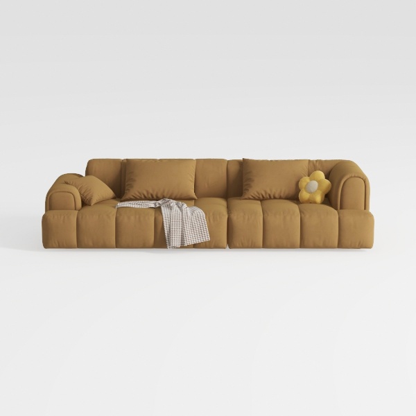 Drawing inspiration from mid-century modern design and organic softness, this sofa blends retro charm with contemporary comfort. Crafted with a warm, earthy mustard hue, its plush, textured fabric invites gentle touches—soft yet durable, with a subtle sheen that catches light softly. The sofa’s modular block design, where each cushion nestles seamlessly into the next, creates a visually cohesive, cloud-like silhouette, balancing structured form with inviting softness.