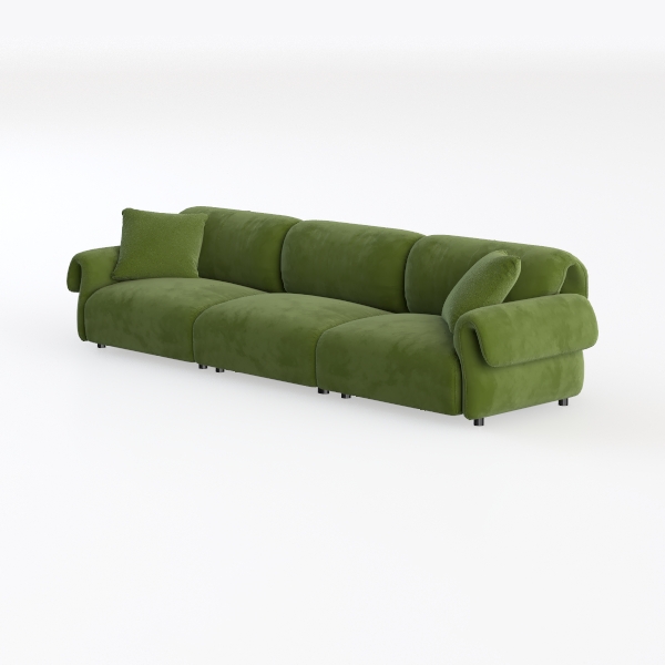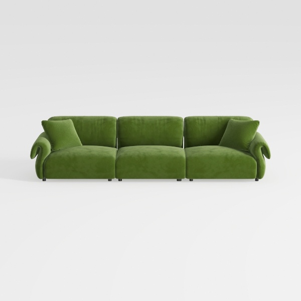 This sofa takes cues from the fluidity of natural forms, particularly the gentle unfurling of leaves, where soft, rounded edges replace sharp lines to craft a piece that feels both modern and deeply connected to organic beauty. Its vibrant sage green upholstery, wrapped in a plush, velvety fabric, invites a tactile experience—each touch reveals a buttery softness that balances comfort with subtle structure, making it as inviting to the eye as it is to the body. The warm, earthy hue infuses the room with a lively, grounded energy, while the three generous seating sections and curved armrests soften the space, turning a living area into a cozy, welcoming retreat.