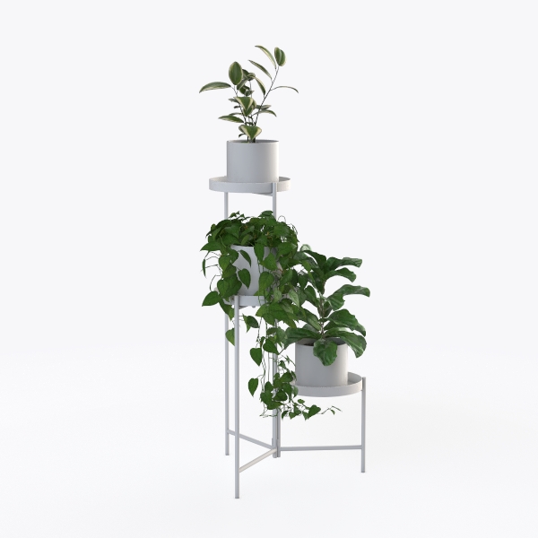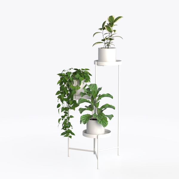 Inspired by merging nature and home, this multi-tiered plant stand features a sleek white metal frame, smooth to the touch, supporting three lush plants—trailing vines, broad leaves, and variegated foliage. It creates a vibrant, airy look, ideal for modern, Scandinavian, or bohemian living rooms and balconies, saving space while showcasing plants at varying heights, enhancing any corner with fresh life.