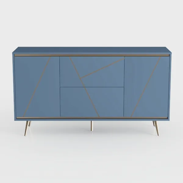 Inspired by bold architectural lines and modern minimalism, this cabinet blends a smooth, matte blue surface with sleek gold geometric accents. Its slender metallic legs add lightness, while hidden compartments offer practical storage. Perfect for a modern-luxe living room, pairing beautifully with neutral sofas and marble surfaces.