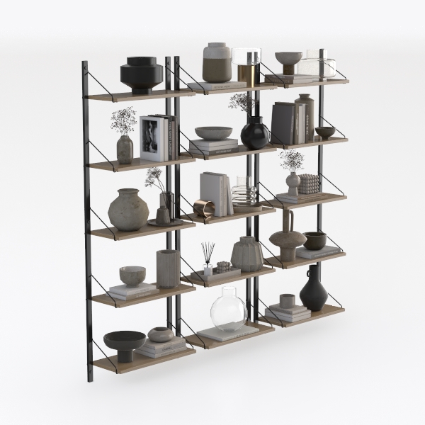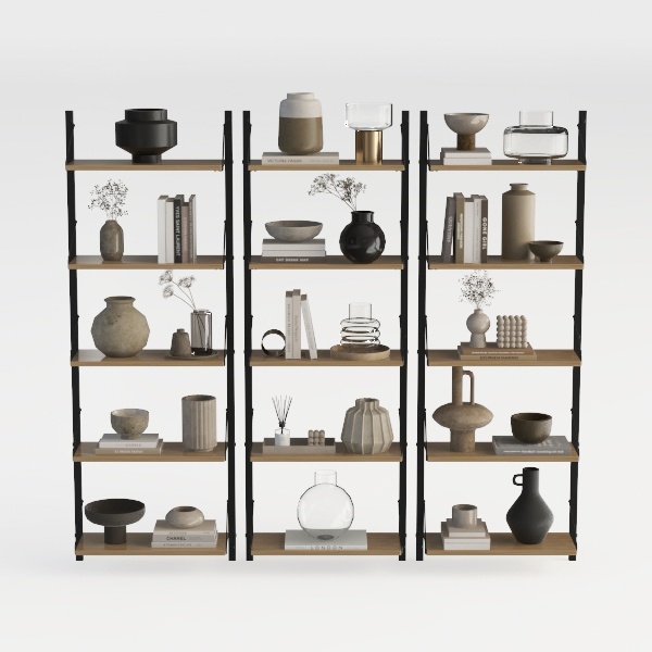 Inspired by minimalist living, this multi-tiered shelf blends warm wooden shelves with sleek metal frames, creating a balanced aesthetic. Textures vary—smooth glass, matte pottery, crisp paper—adding depth to the neutral palette (taupe, gray, black) that feels calm and inviting. Ideal for modern or Scandinavian living rooms, pair with wooden accents and soft lighting. Multiple tiers offer ample space for books, decor, and trinkets, blending functionality with style.