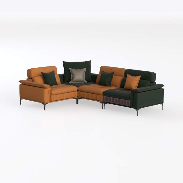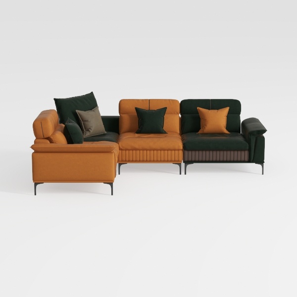 This modular sofa takes cues from the interplay of nature’s warm textures and geometric simplicity. Its design weaves together the earthy richness of forest green with the inviting glow of amber, creating a balanced aesthetic that feels both grounding and vibrant. The fabric, crafted from a plush, velvet-like material, offers a soft, tactile experience—light enough to feel gentle against skin yet sturdy enough to maintain shape, with subtle sheen that catches light subtly.