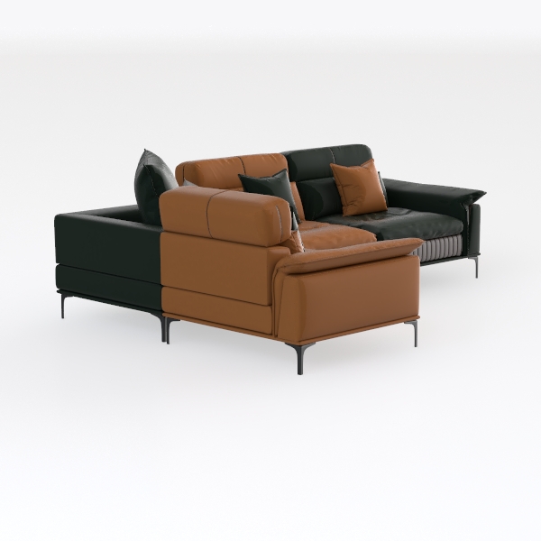 Ideal for a modern-luxury living room, it pairs beautifully with a polished marble coffee table, brass table lamps, and soft beige walls to enhance its warm tones. A textured jute rug adds natural contrast, while wooden side tables with matte finishes complement the sofa’s rich color palette, balancing edge and warmth.