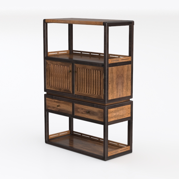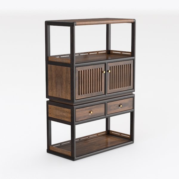 Inspired by traditional Asian furniture, its clean lines and geometric details echo classic craftsmanship. Warm wood tones, with dark frames and light-grained panels, create a textured, layered look. Perfect for a minimalist or new Chinese-style living room, complementing linen sofas and ceramic vases. Spacious drawers and louvered doors offer hidden storage, while open shelves display decor, blending utility and elegance.