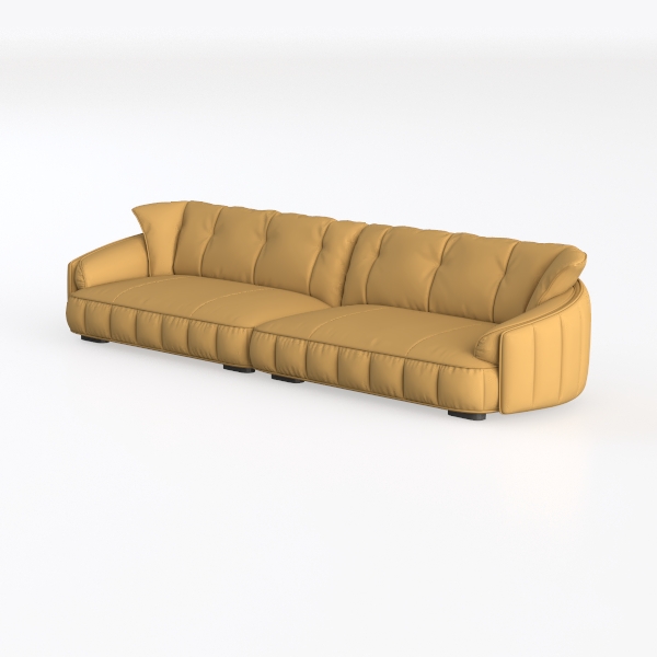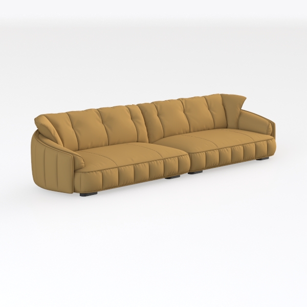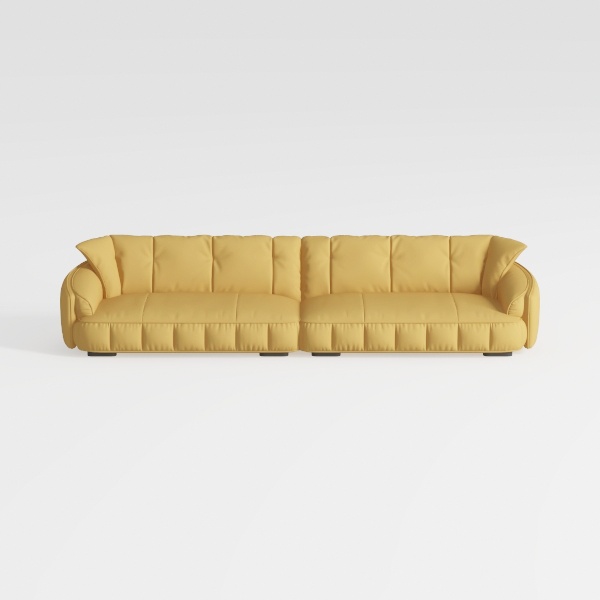 Drawing inspiration from the fluid, curved lines of mid-century furniture design and the warm, golden glow of a setting sun, this sofa merges retro charm with contemporary comfort. Its soft, buttery-yellow upholstery feels surprisingly plush to the touch—like sinking into a cloud—while structured tufted details create gentle, rhythmic indents that add depth without overwhelming its clean silhouette.