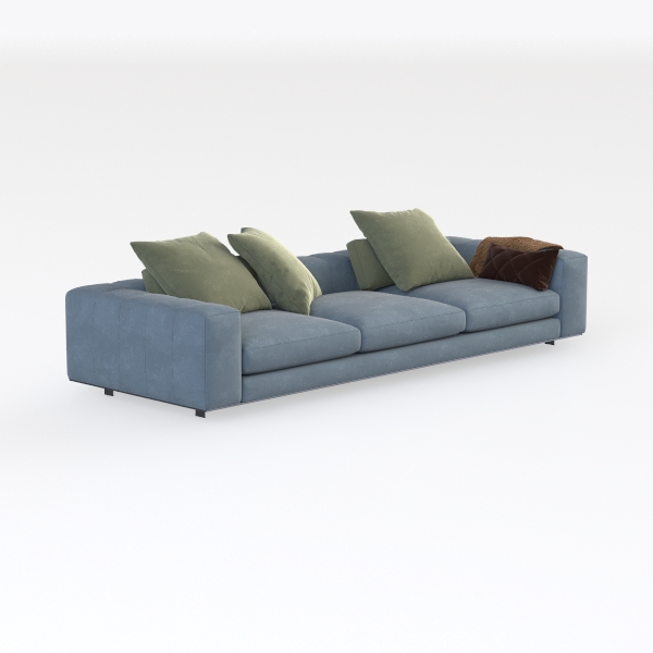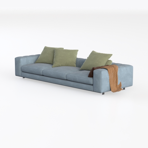 This sofa merges minimalist design with organic inspiration, drawing from soft natural tones and the beauty of uncluttered spaces. Its light blue upholstery, evoking the calm of a misty dawn, creates a serene atmosphere, while three lush sage green cushions add a touch of earthy warmth, crafting a balanced visual rhythm. The textured fabric feels surprisingly soft to the touch—plush yet lightweight, like sinking into a cloud—inviting both casual lounging and lazy afternoons of relaxation.