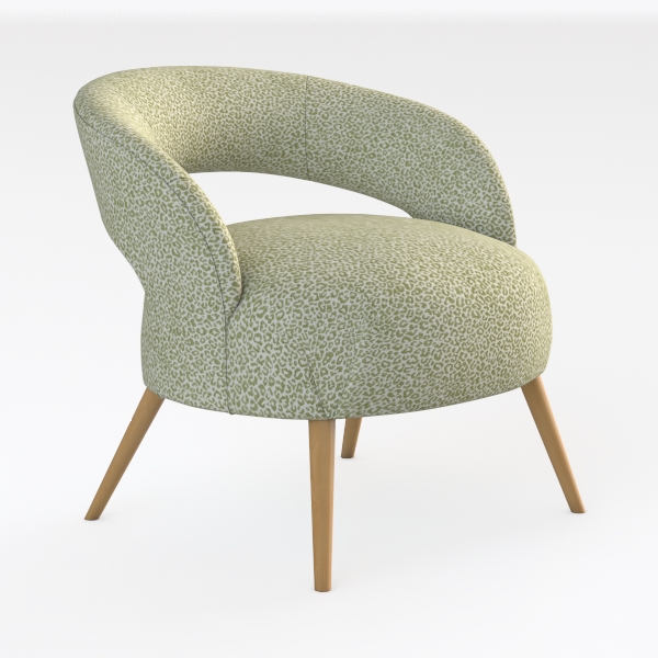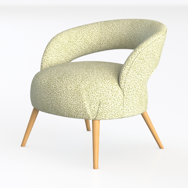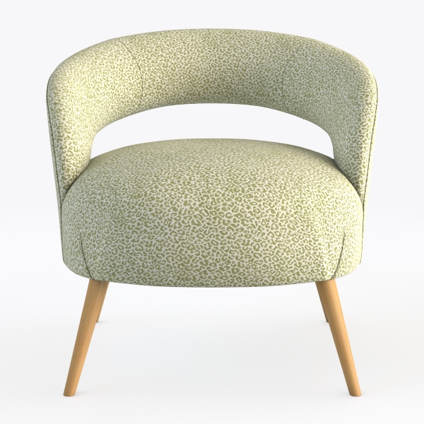 The upholstery, crafted from a fine textured fabric, features a subtle green base dotted with tiny white motifs, resembling moss scattered across stone. It feels luxuriously soft to the touch, offering a plush, inviting surface that invites relaxation, while the curved back gently cradles the upper body, balancing comfort with light support. The legs, turned from smooth, natural wood, are slender yet sturdy, their warm tone creating a harmonious contrast with the upholstery and enhancing the piece’s earthy, organic vibe.