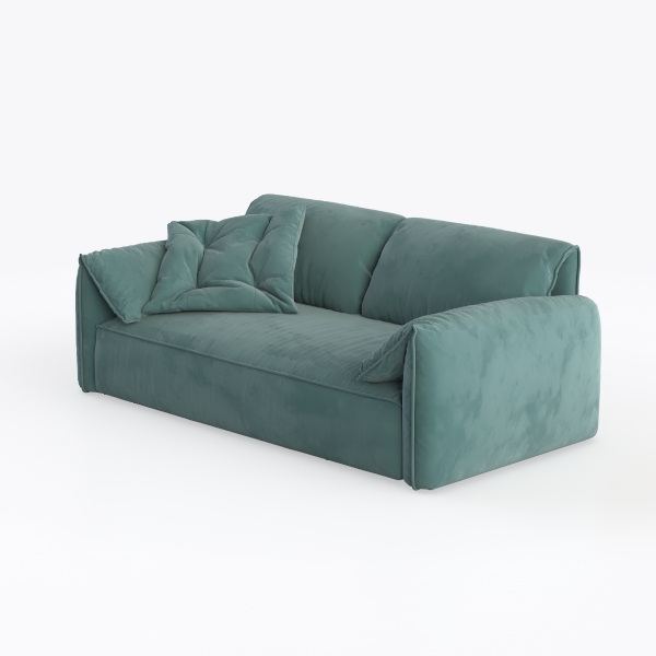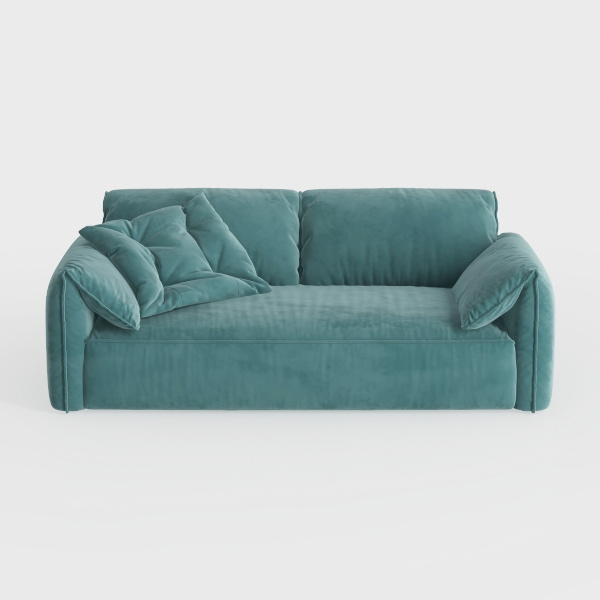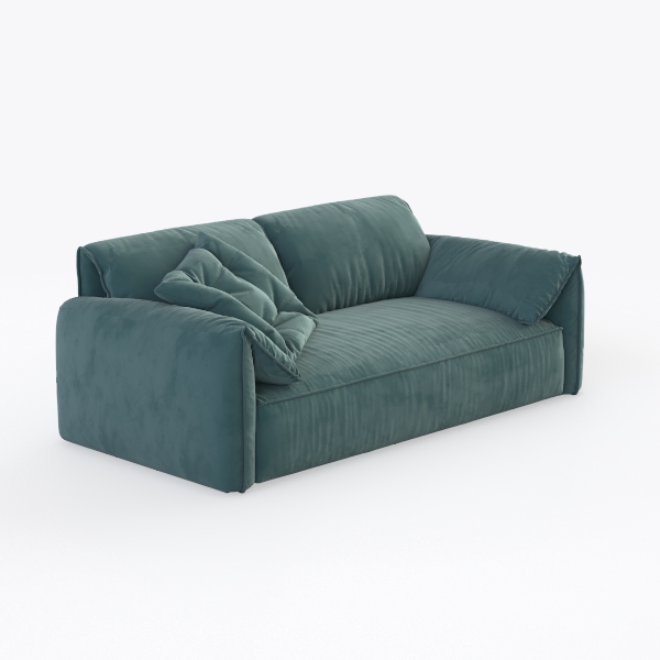 Designed with a harmonious blend of organic serenity and modern simplicity, this sofa takes cues from the soft, muted teal of dawn over still waters and the clean, uncluttered lines of contemporary design. Its upholstery feels like a cloud—velvety to the touch, with a subtle sheen that catches light gently, casting a warm, inviting glow across the room. The curved silhouette, with plump armrests and a gently sloped back, creates a sense of relaxed elegance, making it feel both intimate and visually balanced.