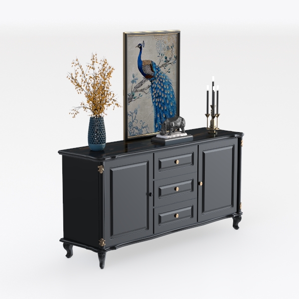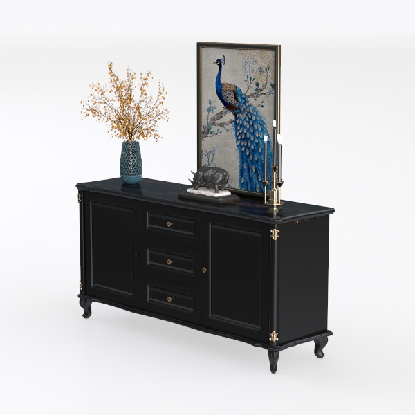 Inspired by nature's vibrant allure, this piece features a sleek black surface with subtle gold accents, exuding modern-luxe charm. Its matte texture contrasts beautifully with the vivid peacock artwork and soft floral touches, while the spacious storage and elegant hardware make it perfect for a refined living room or dining area.