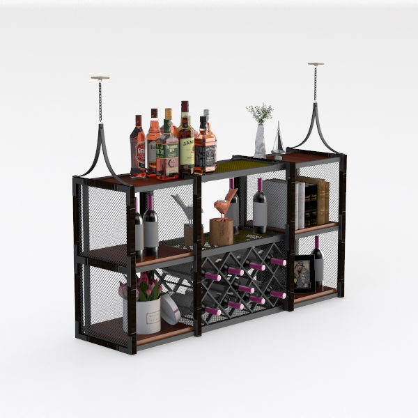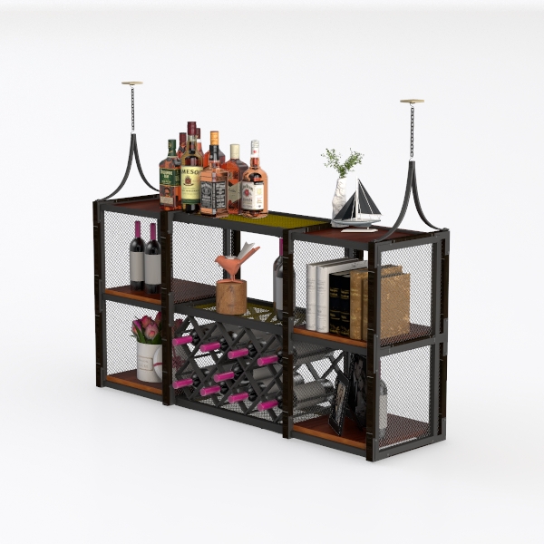 Inspired by blending vintage charm with modern practicality, this piece merges rustic warmth and sleek structure. Dark metal frames contrast warm wooden shelves, pink wine stoppers adding subtle color. Layered with bottles, books, and decor, it creates depth. Perfect for a modern vintage living room or bar, pairing with leather sofas and pendant lights for cozy sophistication. Spacious tiers store wine, spirits, keepsakes; a dedicated wine rack ensures organized storage, balancing style and utility.