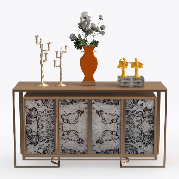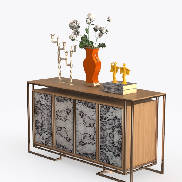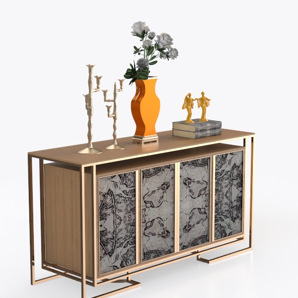 Inspired by mid-century modern artistry, this cabinet features intricate geometric patterns on its doors, complemented by a sleek gold metal frame and warm wooden top. Its blend of rich textures and bold pops of orange and yellow creates a vibrant focal point. Ideal for a contemporary living room or dining area, pairing beautifully with marble accents and metallic decor, while the spacious storage and sturdy build offer both style and functionality.