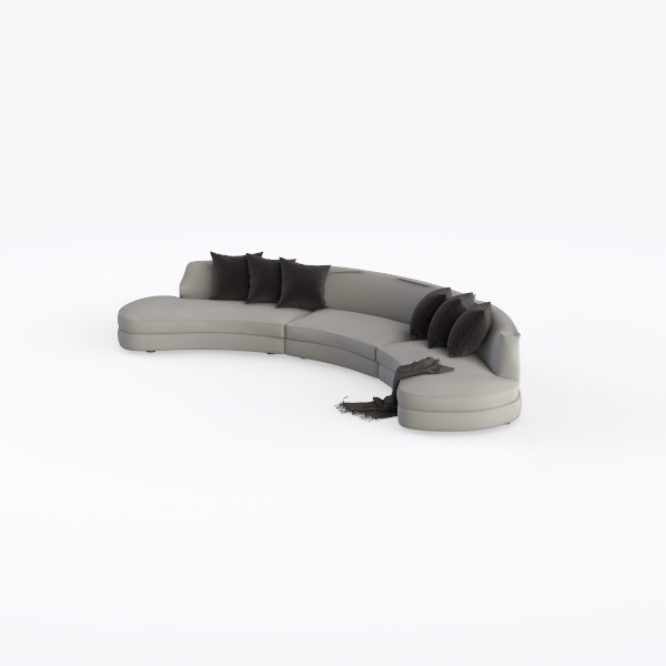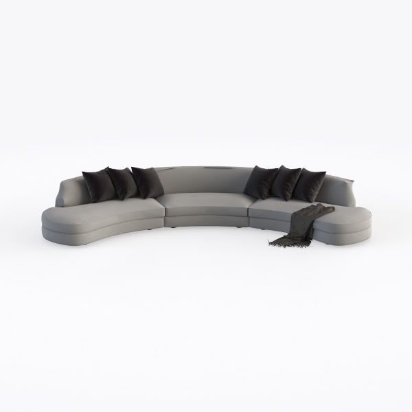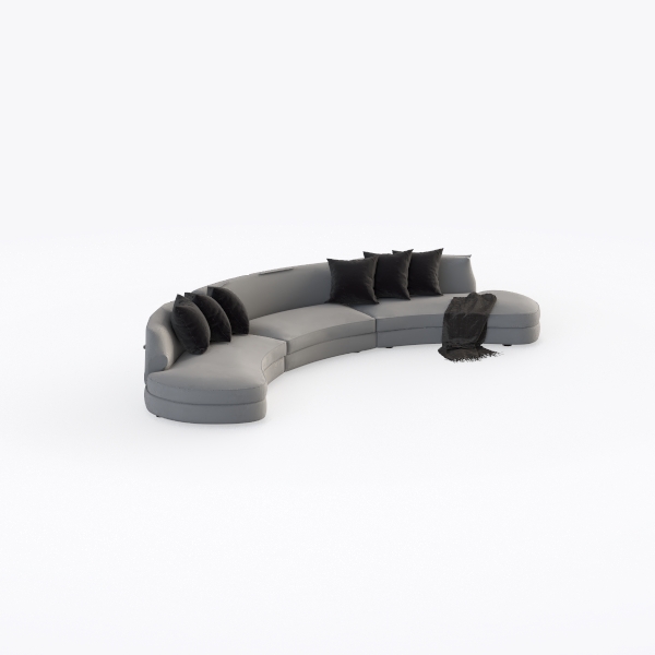 Designed with a soft, organic curvature inspired by the fluid lines of natural landscapes and modern architectural spaces, this sofa blends minimalist elegance with functional comfort. Its muted gray upholstery features a plush, textured fabric that invites gentle touches—soft yet durable, with a subtle sheen that catches light to add depth to the room. The rounded silhouette creates a warm, inclusive vibe, while the five black velvet cushions (three on each arm and two in the center) add a touch of understated sophistication, complemented by a draped charcoal throw that softens the edges.