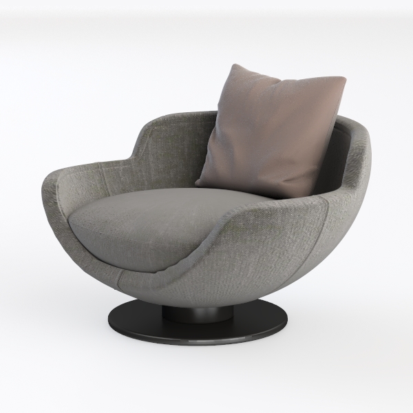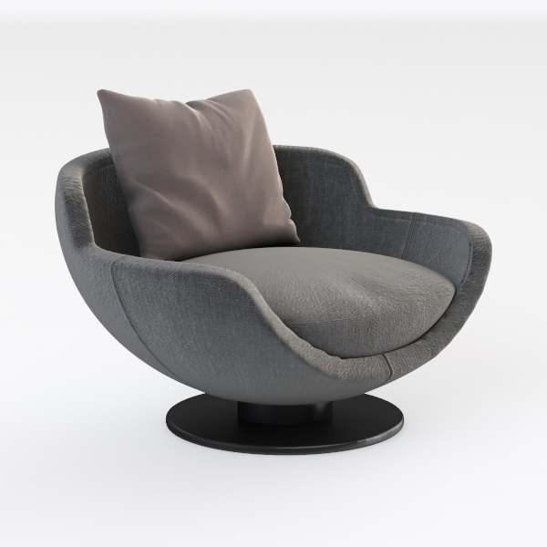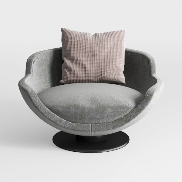 Visually, the chair’s gentle, rounded lines and the contrast of its matte gray fabric against the sleek black base create a balanced, modern aesthetic. The base itself, with its minimalist circular design, adds stability while allowing the chair to swivel smoothly, enhancing its practicality.
