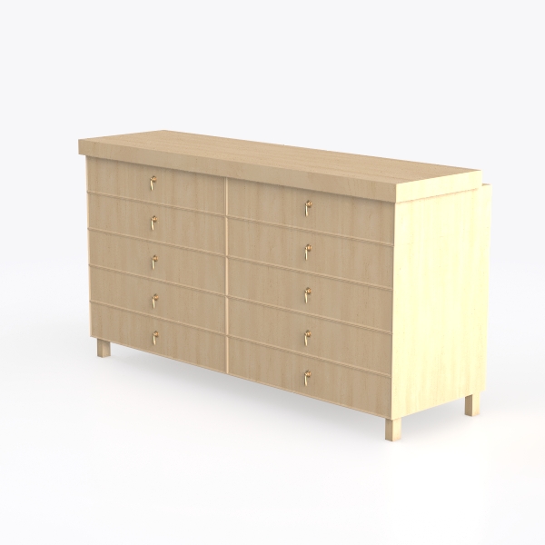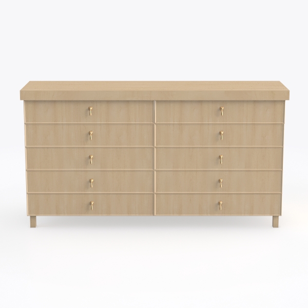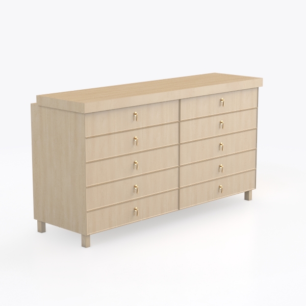 Inspired by mid-century minimalism, this wooden cabinet blends warm, smooth wood grain with clean lines. Its light oak hue feels cool to the touch, highlighting natural patterns for a calm vibe. Perfect for modern/Scandinavian spaces, pair with marble and brass. Eight spacious drawers on slim legs, easy access via gold handles.