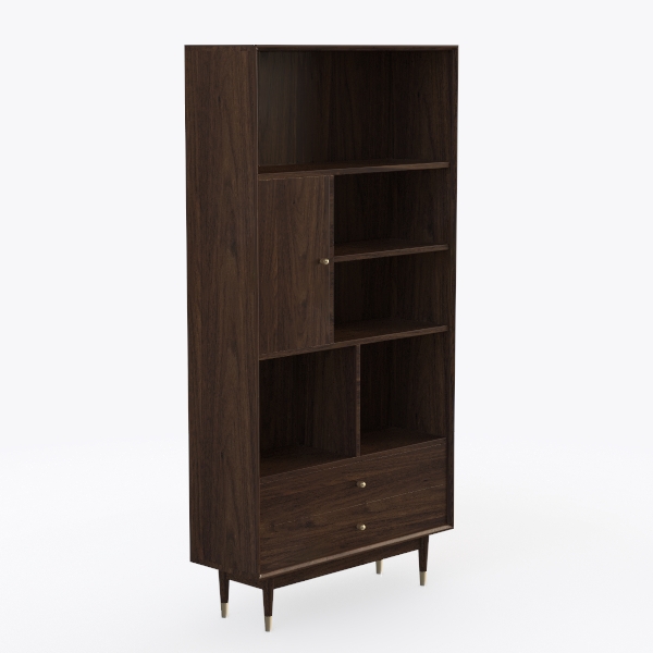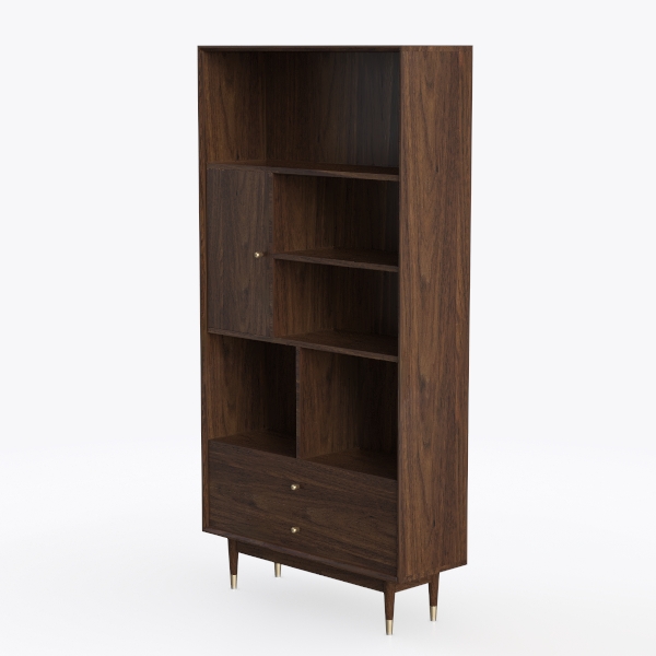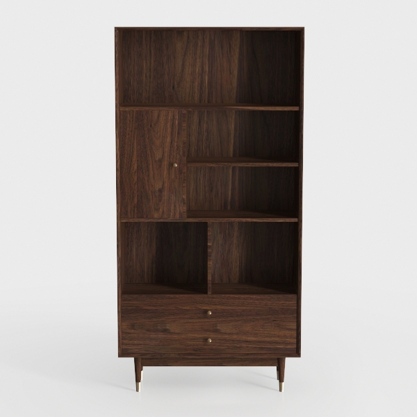 Rooted in mid-century modern design, this shelving unit blends warm nostalgia with contemporary elegance. Crafted from rich, warm-toned wood with visible grain patterns, its smooth surfaces invite gentle touches, while the sleek metal legs add subtle sophistication. Perfect for a modern minimalist living room or cozy home office, it pairs beautifully with marble side tables and vintage brass accents. With a closed cabinet, open shelves, and a handy drawer, it offers versatile storage for books, decor, and daily essentials, balancing form and function seamlessly.