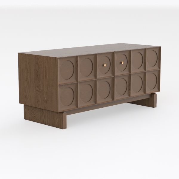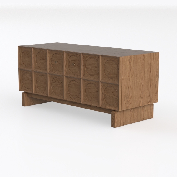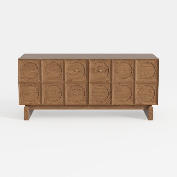 Inspired by mid-century geometric patterns, this wooden cabinet blends retro charm with contemporary simplicity. Its warm oak surface showcases soft wood grain, while circular carved details add subtle visual interest. Perfect for a Scandinavian or modern bohemian living room, it pairs beautifully with linen sofas and vintage rugs. Spacious drawers with smooth brass handles offer ample storage, supported by slender wooden legs for stability.