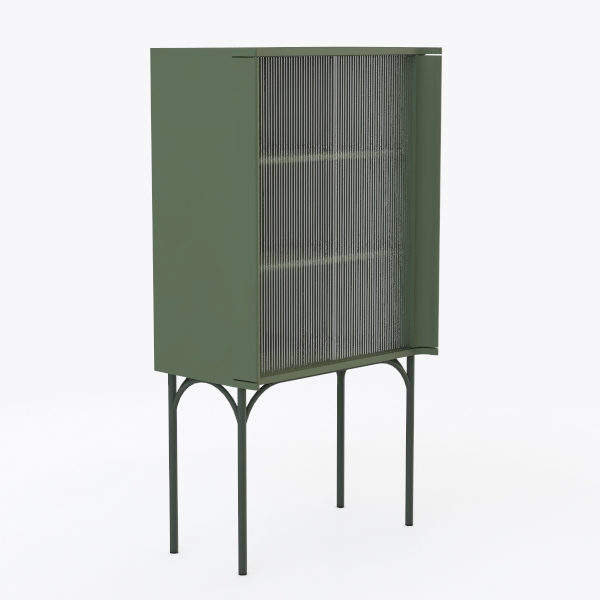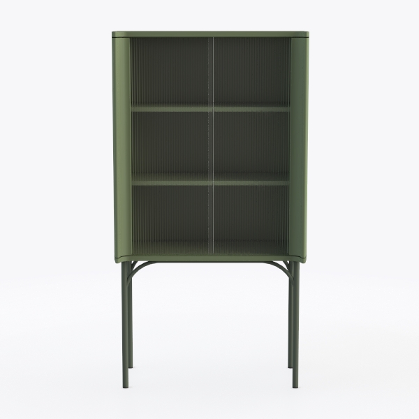 Inspired by nature’s earthy tones and geometric precision, this piece features a matte green finish that feels warm to the touch, with ribbed glass doors adding delicate texture and lightness. Its slender metal legs and open shelving make it ideal for modern living or home offices, pairing beautifully with marble accents and minimalist sofas. Spacious storage and a balanced design blend style and function, perfect for showcasing decor or organizing essentials.