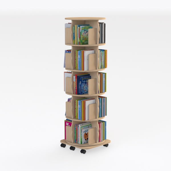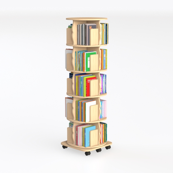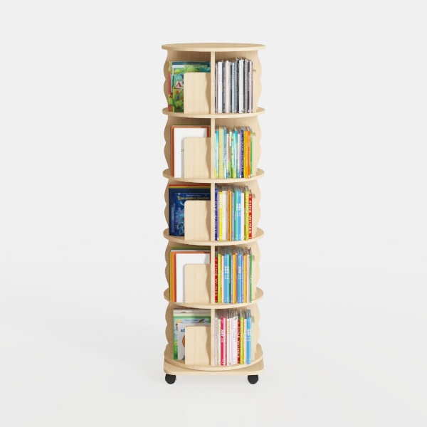Inspired by functional minimalism, this piece blends space efficiency with accessible book display. Its warm, smooth wood grain and light, airy silhouette create a serene, natural vibe, ideal for modern minimalist studies or living nooks. Spacious curved shelves rotate 360 degrees for easy access, while smooth-rolling casters ensure effortless mobility, pairing beautifully with neutral decor and soft lighting.