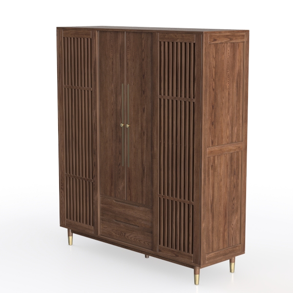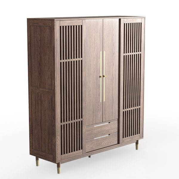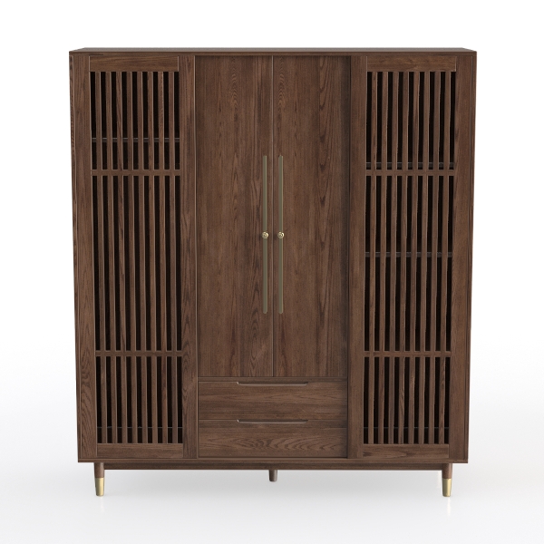 Inspired by traditional Asian latticework, this piece blends warm oak texture with clean lines, its brushed brass handles adding subtle luxury. The wood grain’s natural pattern creates layered visual appeal, while open and closed sections balance ventilation and storage. Ideal for modern minimalist or Scandinavian-inspired bedrooms, it pairs beautifully with soft textiles and geometric decor. Ample storage, including a drawer and cabinet, ensures organized living, with sturdy legs elevating stability.