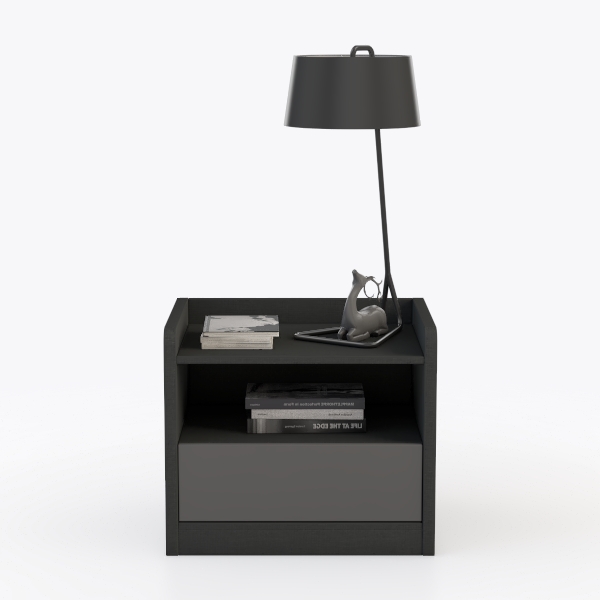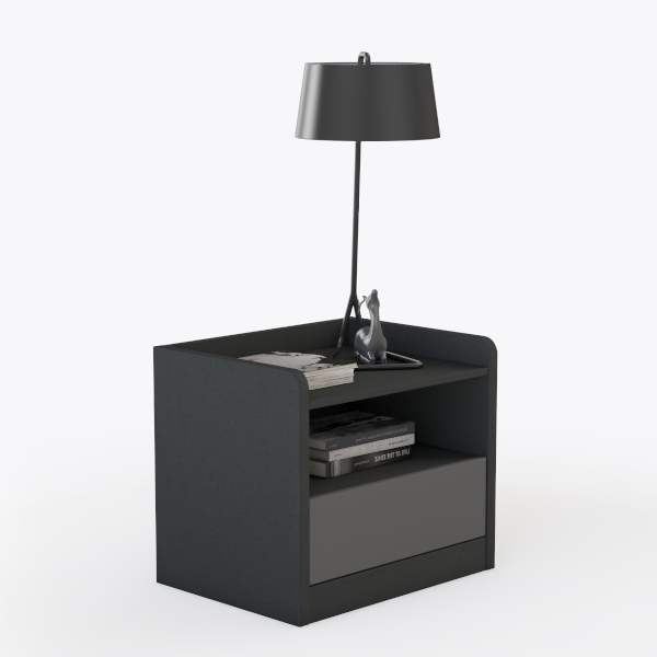 Inspired by minimalist design, this bedside table has a sleek matte black finish—smooth to touch, cool in appearance—with clean lines and a compact, functional structure. It blends seamlessly into modern or Scandinavian bedrooms, pairing well with wooden floors and soft linen, while a hidden drawer offers storage for essentials, and the open shelf holds books or decor within reach.