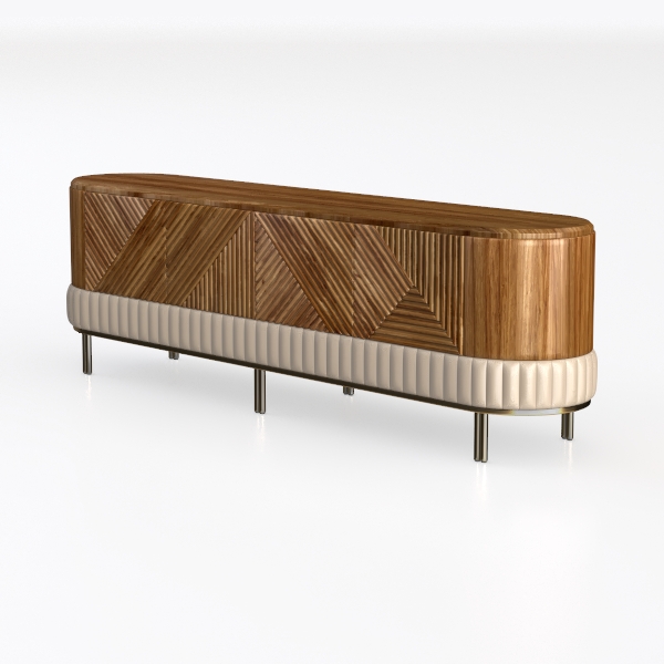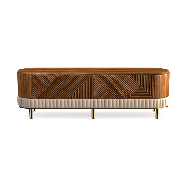 Designed with geometric art deco patterns, the furniture piece features a smooth, warm wood grain top that contrasts beautifully with the soft, textured off-white lower panel. Sleek metal legs add modern elegance, making it perfect for a living room with marble coffee tables and brass accents. Its spacious storage and clean lines blend functionality with timeless style.