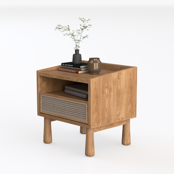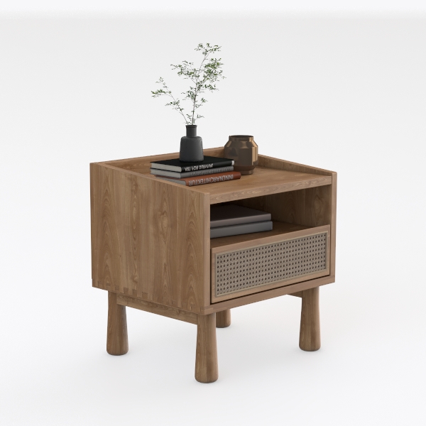 Inspired by organic textures, this wooden side table features a warm oak finish and a tactile rattan drawer. Its light, airy aesthetic blends seamlessly with minimalist or Scandi decor, ideal for a serene bedroom. Spacious storage drawer and sturdy legs offer practicality, complemented by potted plants and vintage books on top.