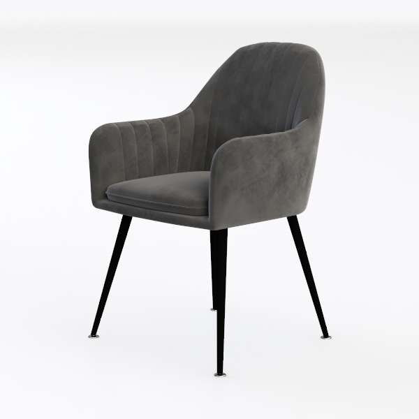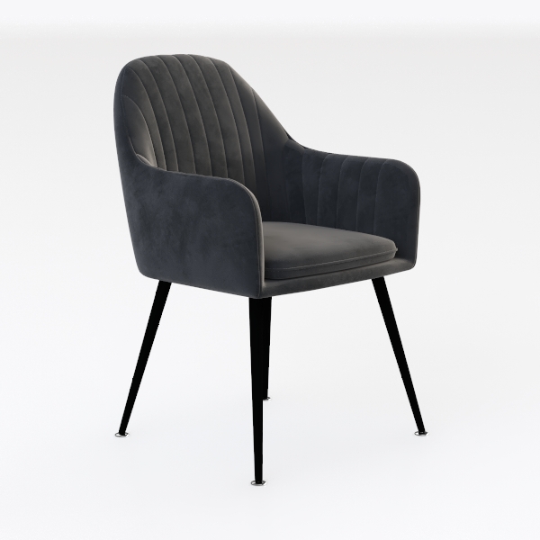 Inspired by mid-century modern design, this chair features soft, velvety gray upholstery with vertical channeling, adding depth. Sleek black metal legs elevate its modern aesthetic, making it perfect for a minimalist living room or dining space. The generous seat depth ensures exceptional comfort, while the ergonomic backrest supports the spine.