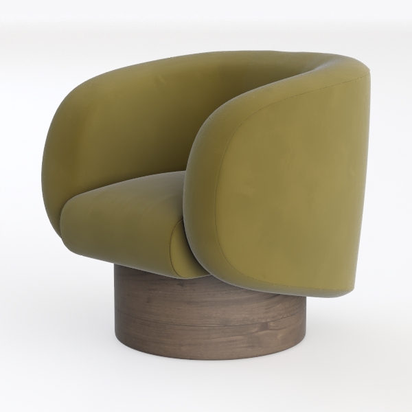 The seat and armrests are upholstered in a warm, muted olive-green fabric, its texture rich and inviting to the touch. It’s the kind of material that feels soft yet durable, promising long-lasting comfort whether you’re curling up with a book or chatting with guests. Below, a solid oak base in a medium, woody tone grounds the piece, its circular shape adding a subtle, modern flair while ensuring steady, balanced support. Visually, the contrast between the plush green upholstery and the earthy wooden base creates a harmonious, grounded aesthetic—warm without being overwhelming, and sleek without feeling cold.