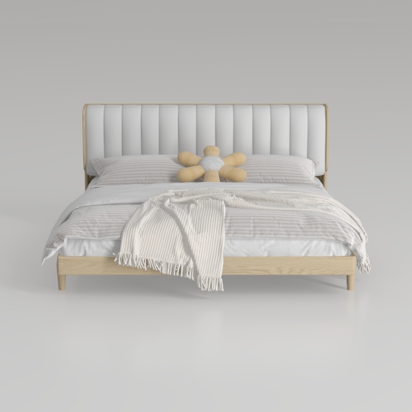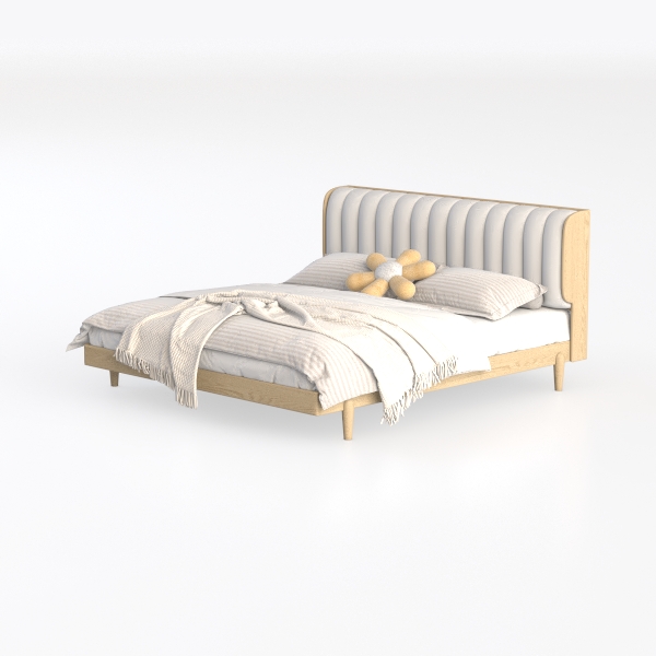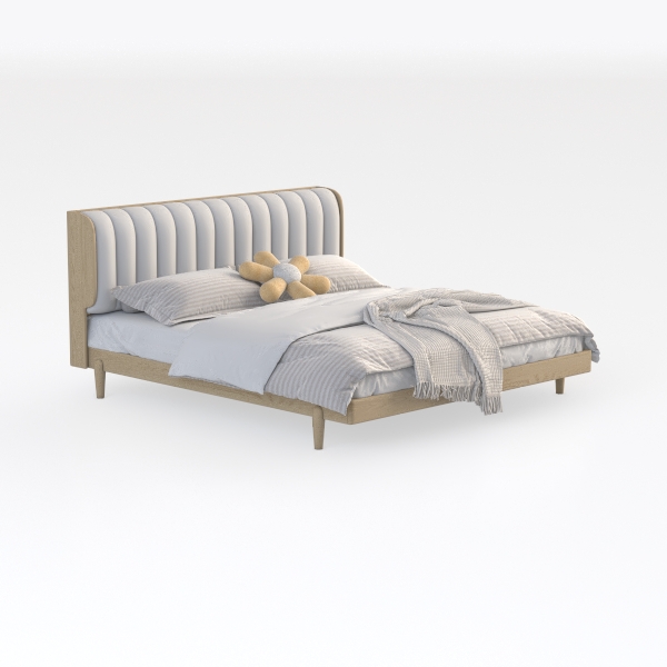 Inspired by Scandinavian minimalism, this bed blends natural warmth with clean lines. Light oak frame contrasts softly with a textured upholstered headboard, offering a cozy touch. Crisp linen bedding and a fringed throw add softness, creating a serene vibe. Ideal for calm Scandinavian or modern minimalist bedrooms, with the headboard providing gentle back support and the low frame enhancing space.