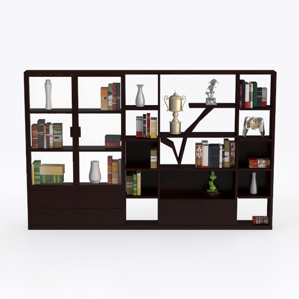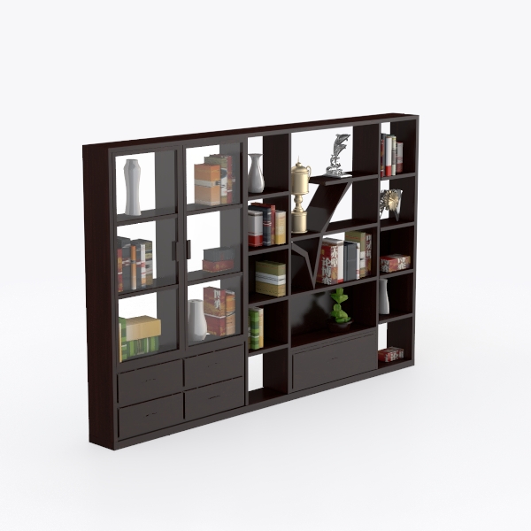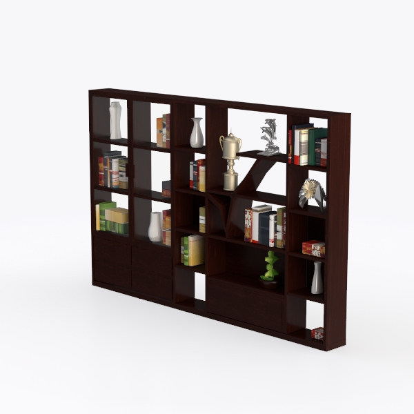 Designed with organic geometric balance, this shelving unit features a rich dark wood finish. Its clean lines and open shelving create a sleek, modern look, with a smooth, polished surface for tactile comfort. Perfect for modern minimalist or industrial living spaces, pair it with sleek metal accents and soft textiles. Spacious compartments and hidden drawers offer versatile storage for books, trophies, and decorative items, blending functionality with style.