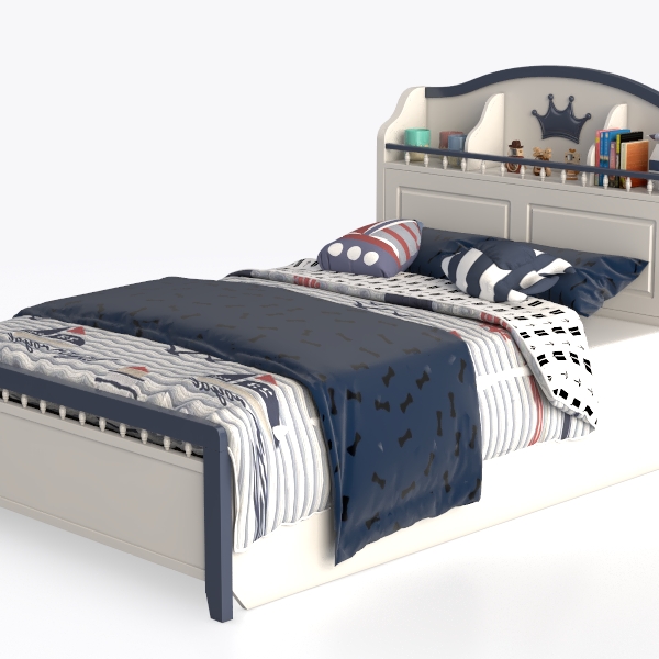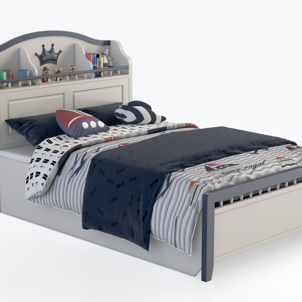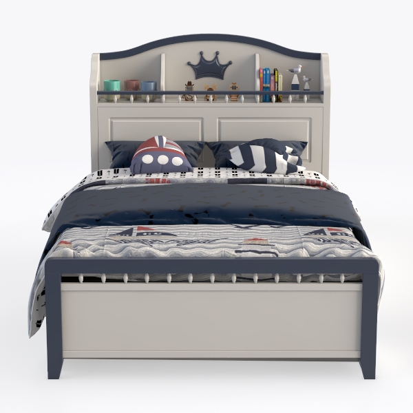 Inspired by royal fairy tales, this bed has a smooth wood frame, crisp white and navy headboard with a tiny crown detail. Textured bedding with playful nautical patterns adds warmth, while built-in headboard shelves keep books and toys organized. Ideal for a modern kids' room, pairing with wooden desks and soft rugs for a cozy, clutter-free space.