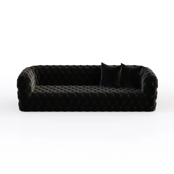 Crafted with a nod to timeless elegance, this sofa draws inspiration from the refined lines of classic Chesterfield sofas, reimagined for modern living with a focus on comfort and understated luxury. The deep, plush upholstery in a rich, matte black hue feels incredibly soft to the touch—velvety yet structured, inviting you to sink in while maintaining a polished silhouette. The meticulously stitched tufting across the back and seat adds a textural contrast: smooth, curved upholstery balanced by the crisp, defined dimples of the buttons, creating subtle depth that catches light gently.