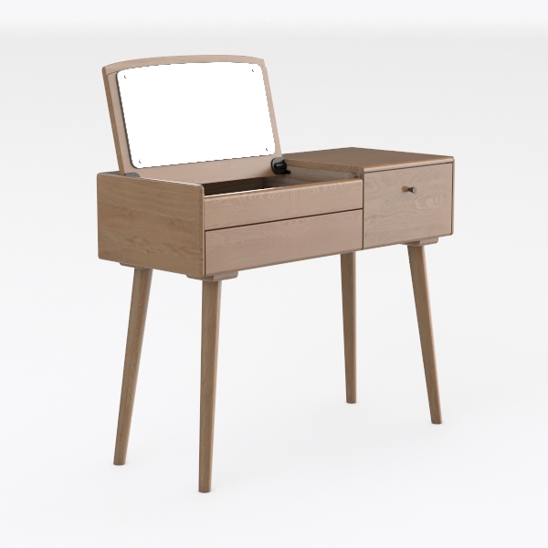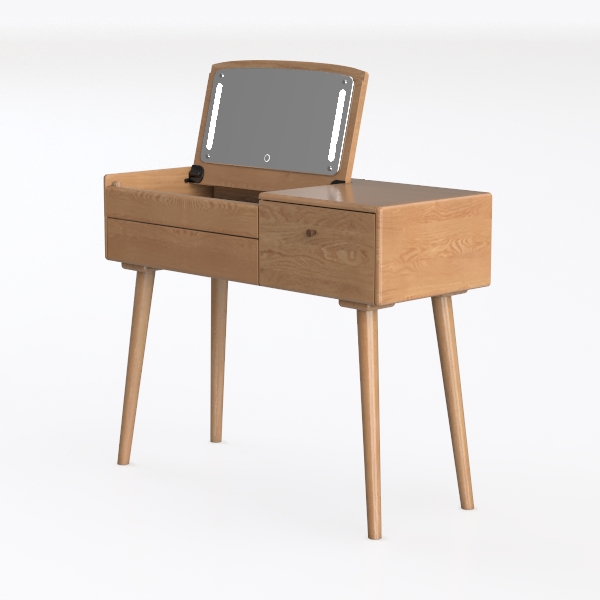 Inspired by mid-century modern minimalism, this vanity blends warm oak finish with smooth curves and clean lines. The natural wood grain and softly polished surface offer a tactile, inviting feel, while the tilted mirror adds elegance to the visual appeal. Ideal for a minimalist bedroom or retro-inspired space, it pairs beautifully with linen cushions and vintage decor. Spacious drawers and a tilting mirror provide ample storage for beauty essentials, balancing style and practicality.