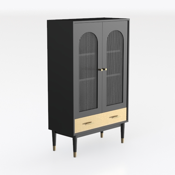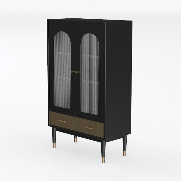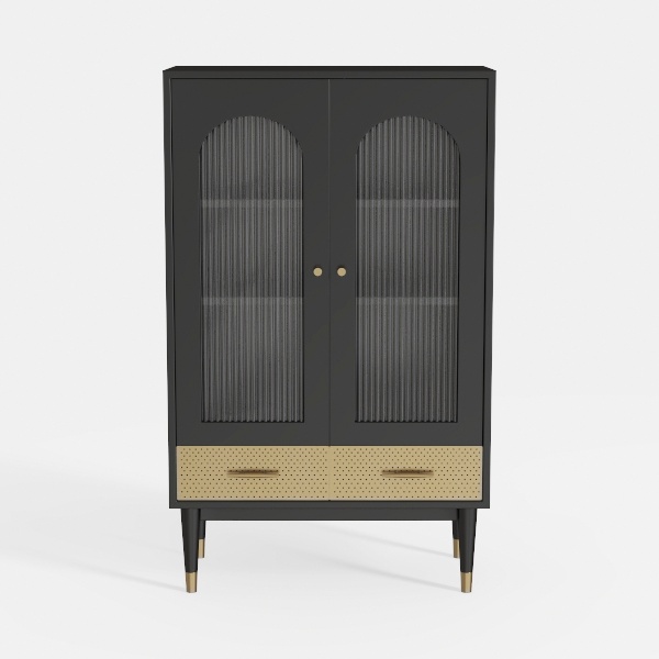 Blending mid-century charm with contemporary elegance, this cabinet draws inspiration from vintage design with a modern twist. Its matte black finish contrasts beautifully with warm gold accents on drawer fronts and tapered legs, while ribbed glass doors add subtle texture and soft light. Perfect for a modern-luxury living room or study, it pairs with marble and metallic decor. Two lower drawers offer hidden storage, ideal for displaying collectibles or books.