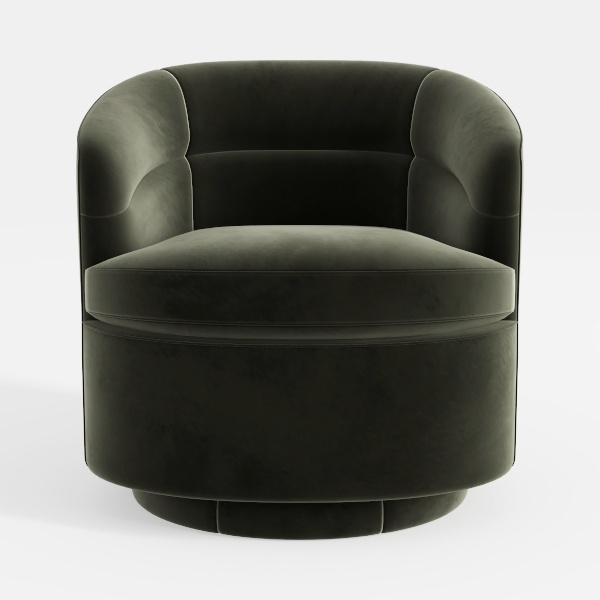 Crafted with a focus on fluid form, this armchair draws inspiration from the soft, rounded silhouettes of mid-century modern furniture and organic architecture, blending timeless elegance with contemporary comfort. The rich, deep forest green velvet upholstery feels incredibly soft to the touch, its plush texture catching light to create subtle, inviting shadows across its curved surfaces—from the gently sloping armrests to the full, rounded back, which wraps around the body like a gentle embrace.