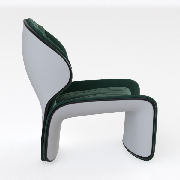 This striking armchair draws inspiration from the fluid lines of natural forms, such as the gentle curves of a seashell or the flow of water, creating a sculptural silhouette that feels both organic and contemporary. Its velvety emerald-green upholstery, with soft, vertical channel tufting, adds a tactile richness—running a hand over the fabric reveals a sumptuous, almost buttery texture that invites relaxation. The crisp white base, with its sleek, slightly angled profile, contrasts beautifully with the deep green, while the thin black trim along the edges defines the chair’s shape, balancing softness with subtle structure.