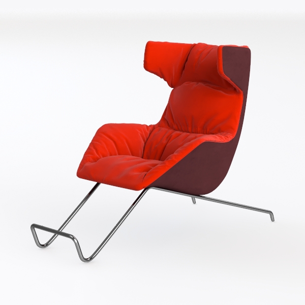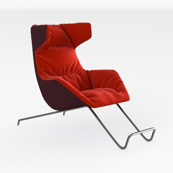 This eye-catching armchair finds its design roots in the harmony of soft, flowing silhouettes and intentional minimalism, merging the organic warmth of natural curves with the sharp, structured elegance of modern interiors. At its core is a lush, deep-red upholstery, crafted from a sumptuously soft, velvety fabric that feels as inviting as it appears—its rich, warm hue catching light gently to create a subtle, luminous glow. The chair’s most distinctive feature is its textured, gathered details: the high, curved backrest and wide, padded armrests cradle the body, while loose folds in the fabric add depth and a sense of relaxed luxury, as if the piece itself has been shaped by a soft breeze. Contrasting this plush softness is a sleek, matte black metal frame, its thin, angular legs and crossbar base balancing sturdiness with a lightweight, almost weightless presence, grounding the chair without overwhelming its fluid form.