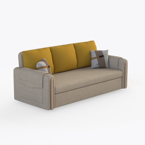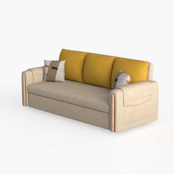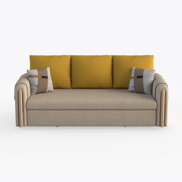 The seat, wrapped in a textured beige fabric, offers a gentle, tactile experience—its weave catching light to add depth without overwhelming. Behind it, three plump, sunflower-yellow cushions serve as a cheerful contrast, their smooth, slightly satiny surface bringing a touch of warmth that feels both intentional and effortless. Flanking the sides, slim, sanded wooden armrests add a natural, organic touch, their light grain complementing the upholstery’s softness.