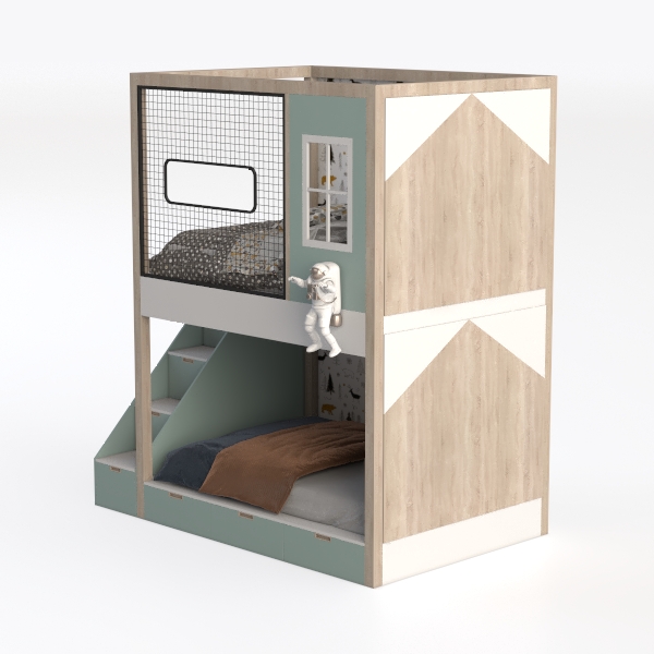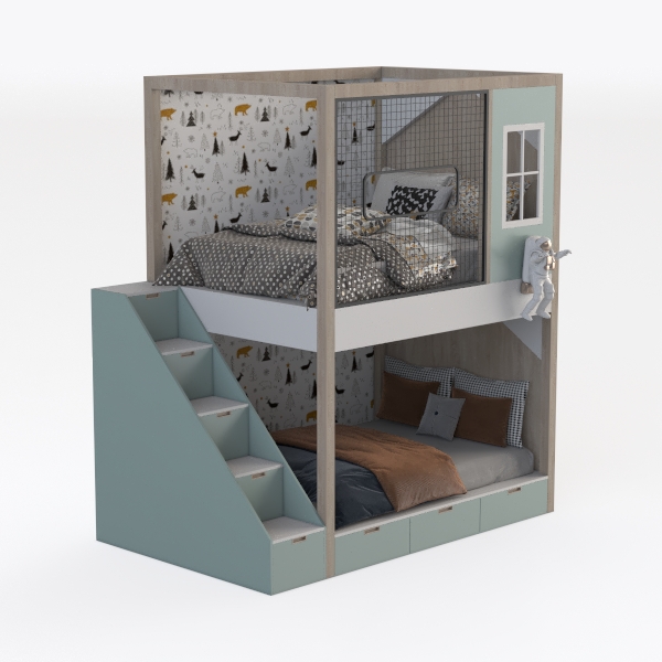 Inspired by nature, the design blends forest-themed patterns with soft, warm tones, creating a cozy and adventurous vibe. Light wood frames and mint accents add a fresh, gentle touch, while playful animal and tree motifs bring a lively, child-friendly feel. Perfect for a kid’s room, it pairs with plush toys and natural decor, enhancing a Nordic or whimsical style. Staircase with built-in drawers offers storage, and the upper guardrail ensures safety, making it practical and charming.