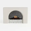 A 3D model of a Fireplace Cabinet, featuring an arched design, white body, gray interior, and speckled base with flame effect, and a modern minimalist aesthetic. It has low polygon count and is suitable for home decor, especially living rooms.