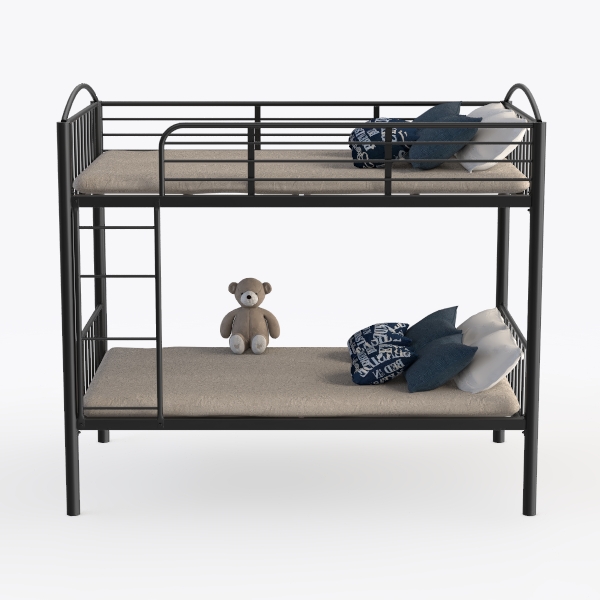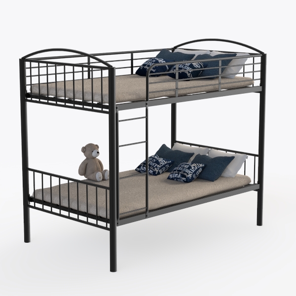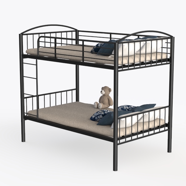 Inspired by space-efficient family living, this bunk bed features a sleek black metal frame with clean lines, contrasting gently against soft beige mattresses. The smooth rails and plush bedding create a warm, minimalist vibe, ideal for a child’s room or compact home. Sturdy construction and a ladder ensure safe, practical access, blending functionality with cozy charm.