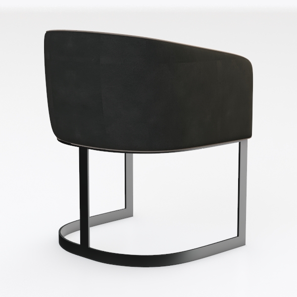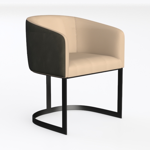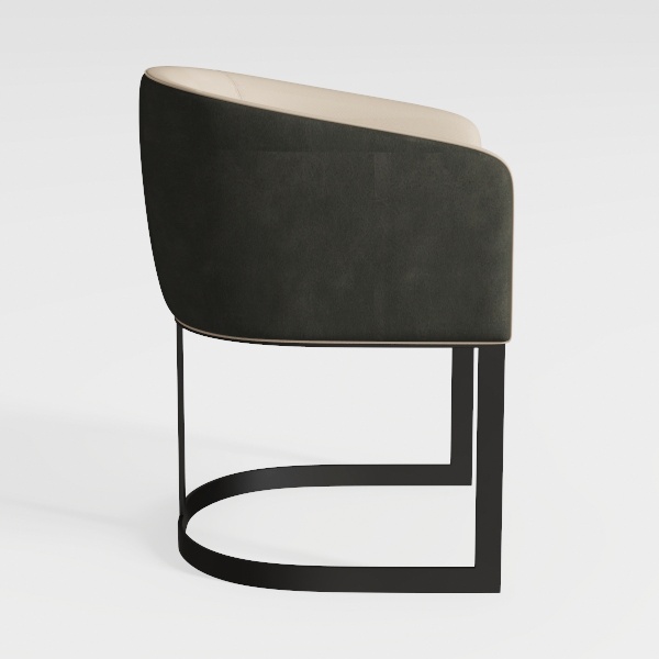 Inspired by geometric architecture, this chair merges modern minimalism with soft comfort. Its dark textured upholstery contrasts subtly with a smooth cream seat, while sleek black metal legs form a fluid, angular frame that catches light beautifully. Ideal for a contemporary dining room, it pairs effortlessly with marble or wooden tables and matte black accents, enhancing a minimalist or luxury space. The curved back and generous seat depth offer excellent lumbar support, making it both stylish and practical for daily use.